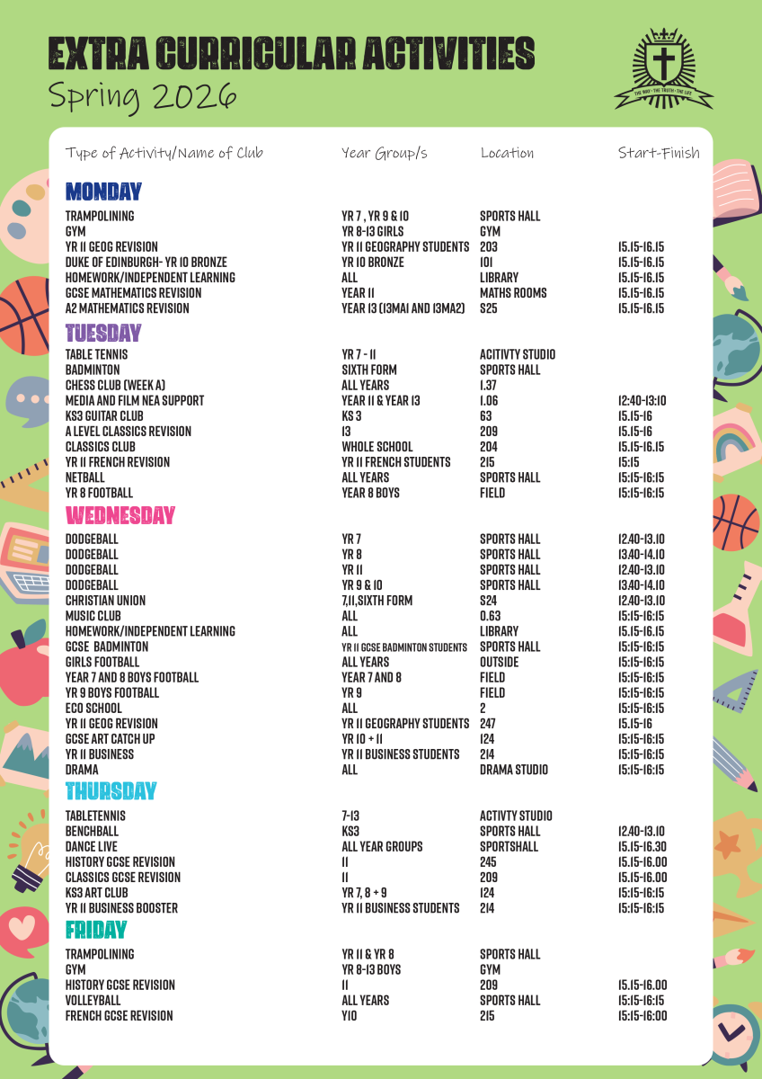 There is an extensive range of extra-curricular enrichment activities and clubs at Christ the King College, some activities are designed to support the curriculum, such as Homework clubs and lesson specific catch-up. Some activities are extra-curricular and are there to provide the additional experience of taking part in a fun and interesting activity with other students outside of normal lessons. Some clubs are specifically aimed at certain years, whilst others are available for all.